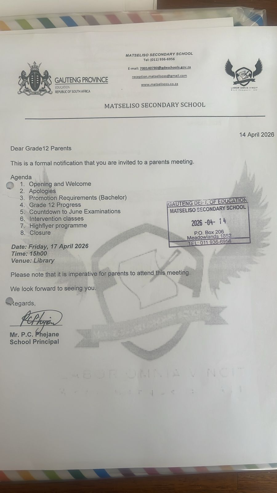 You are hereby formally invited to attend an important Grade 12 parents’ meeting. The purpose of this meeting is to engage with parents on key academic matters affecting learners and to strengthen collaboration in supporting learner performance.